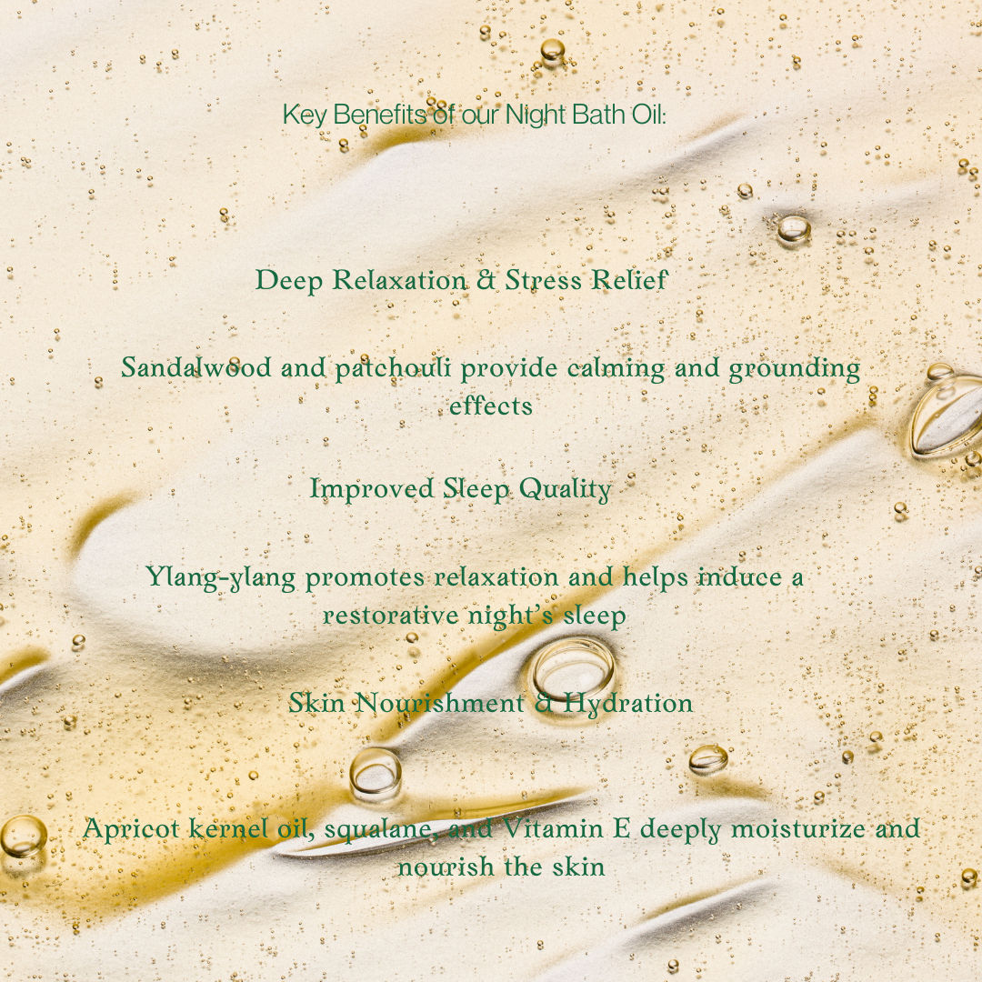 Experience the epitome of luxury with our exquisite Night bath oil, Specially formulated to cater to your every need. Whether you seek to unwind with the calming effects of sandalwood, revitalize with the soothing properties of chamomile, alleviate stress with grounding patchouli, or soothe tired muscles with the tranquillity of neroli, our night bath oil has it all. Enjoy a restorative night’s sleep with ylang-ylang and bolster your immune system with the relaxation induced by lavender. Transform your bath into a sanctuary of relaxation and rejuvenation with this luxurious bath oil.